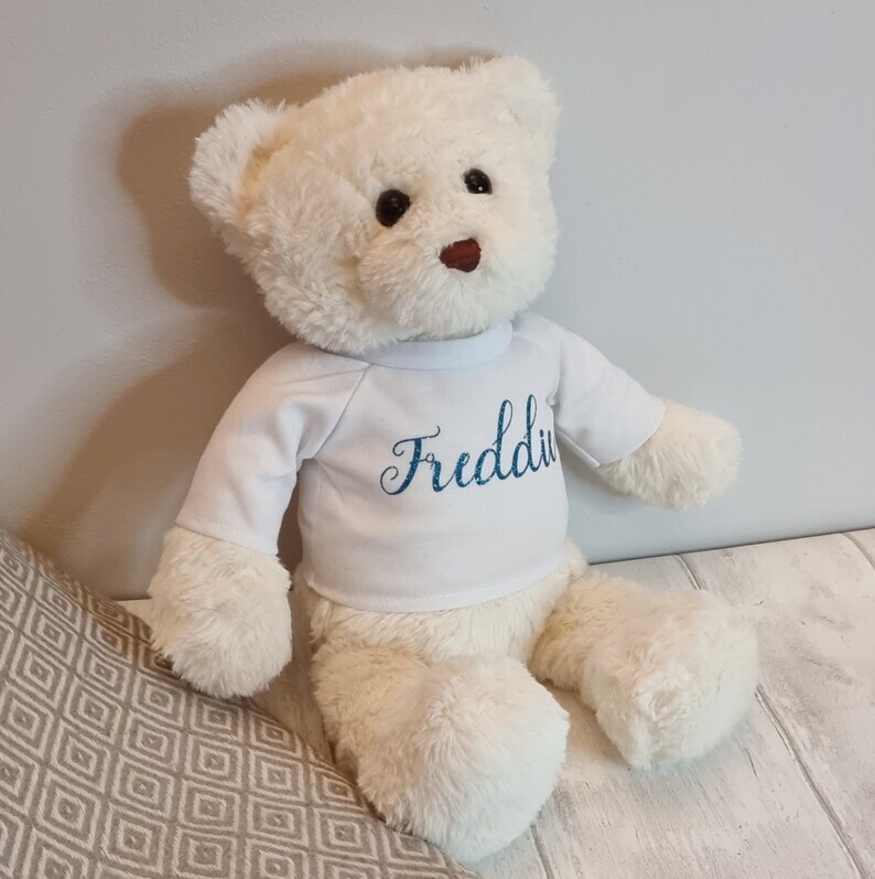 A super cute, super soft and super fluffy personalized teddy bear, wearing a white cotton t shirt personalized with any name of your choice in a lovely blue glitter writing and finished with a silver bow